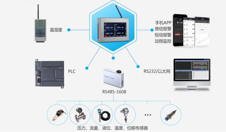 :采用工业级RS485-1608数据采集卡接口小巧便携,可导轨安装。专业采集电压、电流、温度、湿度、压力、振动、频率、流量、液位等信息。
