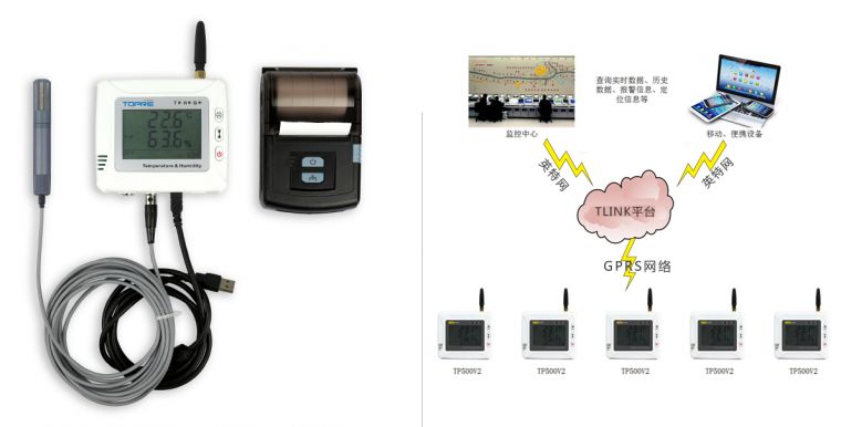 传感器+TP500V2.0+打印机组成一套冷链监控单元,。探头可以是单通道温湿度或双通道温度。支持云平台连接,手机APP/微信/WEB远程数据监控。