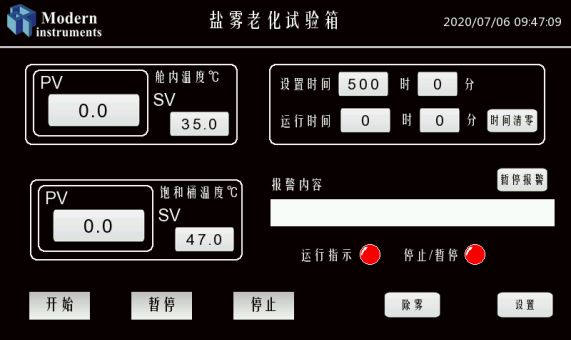 设定好温度后,加热系统开始工作,当实验舱和饱和桶的实际温度接近设定温度时(般在5℃内)这时喷雾系统开始工作,即试验开始;