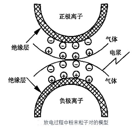SPS烧结机理目前还没有达成较为统一的认识,其烧结的中间过程还有待于进一步研究。SPS的制造商Sumitomo公司的M.Tokita最早提出放电等离子烧结的观点,他认为:粉末颗粒微区还存在电场诱导的正负极,在脉冲电流作用下颗粒间发生放电,激发等离子体,由放电产生的高能粒子撞击颗粒间的接触部分,使物质产生蒸发作用而起到净化和活化作用,电能贮存在颗粒团的介电层中,介电层发生间歇式快速放电,在粉末颗粒未接触部位产生自发热。