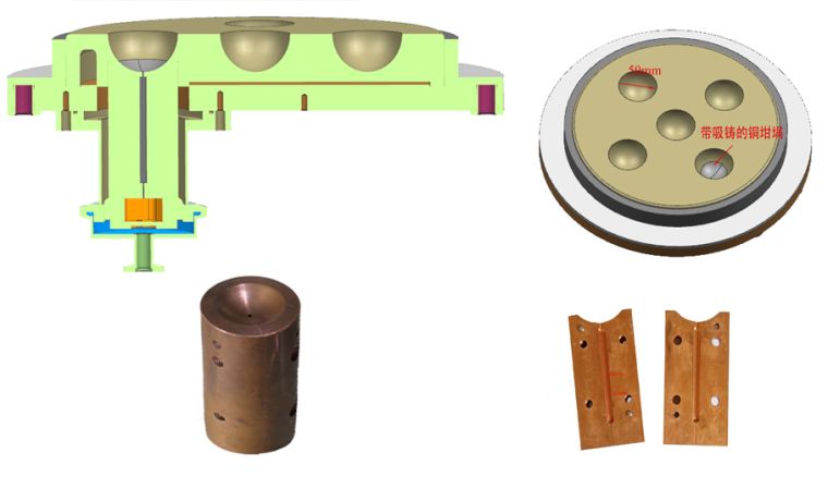 | 铜坩埚 | 水冷铜坩埚有5个工位(也可定制其它数量的工位) 每个工位均为半径是21mm的半球锅(也可定制其它尺寸),最大熔炼量10g(按铁液计算) 其中一个工位底部安装有吸铸装置