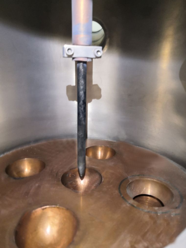 | 直径为10mm的钨电极(电弧枪可通水冷却),非自耗式钨电弧针 电极与样品的角度和距离可调节(最大调节距离为80mm) 每个工位可熔炼样品量< 10 g,最高温度可达3000℃ 下图是用此电弧炉熔炉的5g钛合金