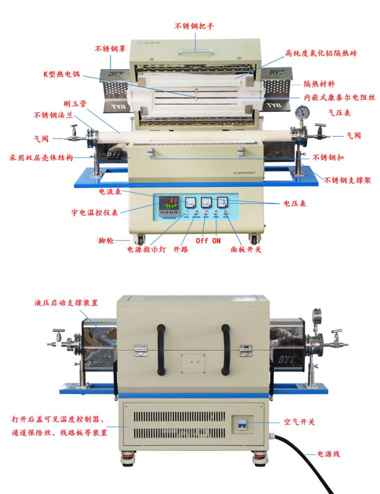 这款对开管式炉以电阻丝为加热元件,采用双层壳体结构和30段程序控温系统,移相触发、可控硅控制,炉膛采用氧化铝多晶纤维材料,具有温场均衡、表面温度低、升降温度速率快、节能等优点,是高校、科研院所、工矿企业做高温气氛烧结、气氛还原、CVD实验、真空退火用的理想产品。