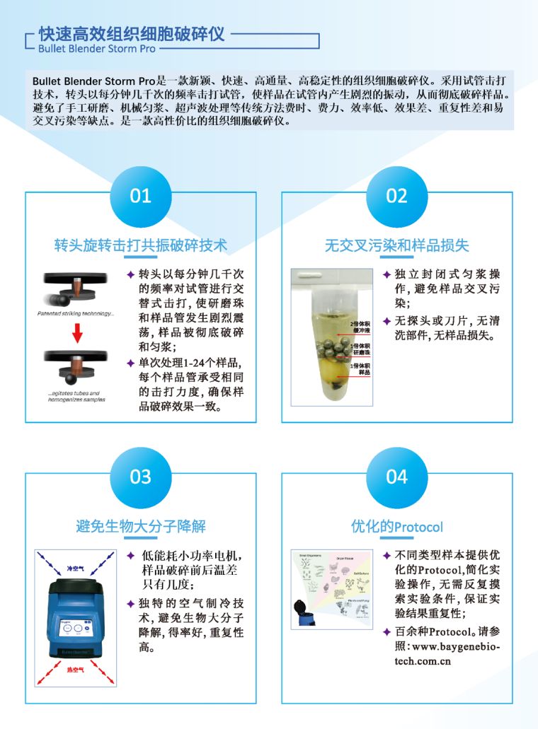 Bullet Blender Storm Pro是一款新颖、快速、高通量、高稳定性的组织细胞破碎仪。采用试管击打技术,转头以每分钟几千次的频率击打试管,使样品在试管内产生剧烈的振动,从而破碎样品。避免了手工研磨、机械匀浆、超声波处理等传统方法费时、费力、效率低、效果差、重现性差和易交叉污染等缺点。是一款高性价比的组织细胞破碎仪。