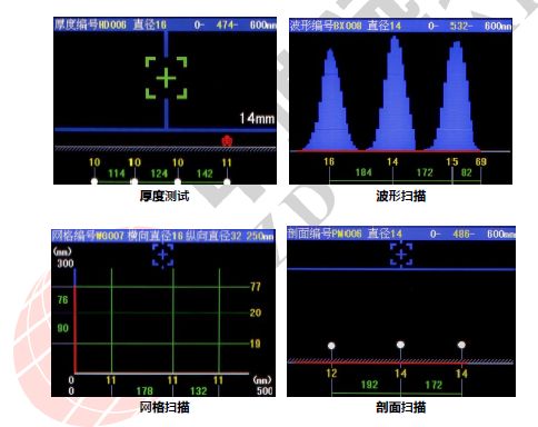 ◆厚度测量、网格扫描、波形扫描、剖面扫描四种都完全实现在测量过程中可以任意前后翻页、查看数据和图形以及随时后退删除操作有误测试数据,便于现场测试使用;