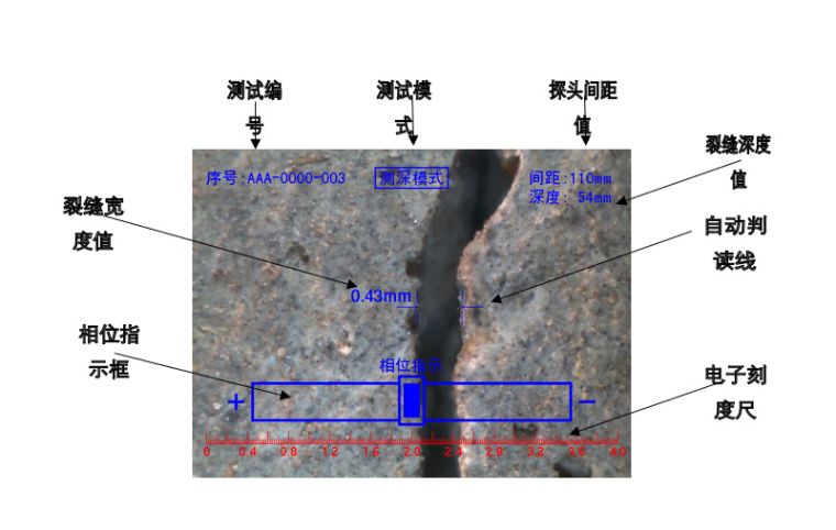 设备主要由便携式彩色显示主机、彩色显微放大探头以及超声波测试探头等构成。测试时用户可直接从主机的液晶屏上读取裂缝宽度或深度的检测数值,也可以对需要记录的裂缝进行拍照(拍摄的照片中可保留检测出的裂缝宽度和深度值)。用户可在主机上浏览所存储的照片,也可下载到计算机上做进一步的分析或打印存档。