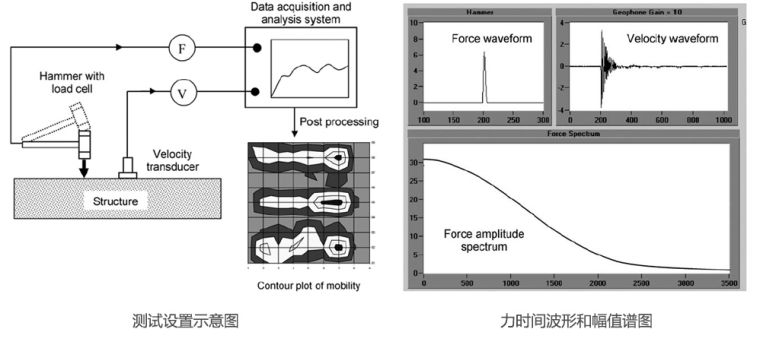 一个力锤,测试瞬态冲击力,同时,使用速度传感器,测量测试目标产生的振动。在板状结构中,虽然激发产生了多种模态,但是冲击主要导致测试单元产生弯曲振动。将力锤和速度传感器的时间域的波形转换到频率域,用来计算导纳谱,并对其进行分析,获得代表单元响应的参数。应用这些参数,确定已测试单元的异常区域。