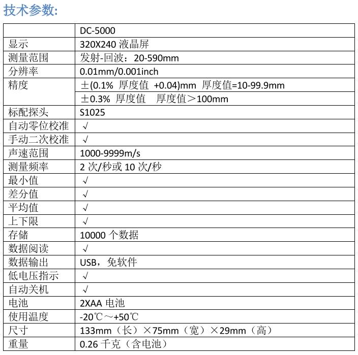 2. 分辨率 0.01 mm,测量范围:发射-回波:20mm-590mm