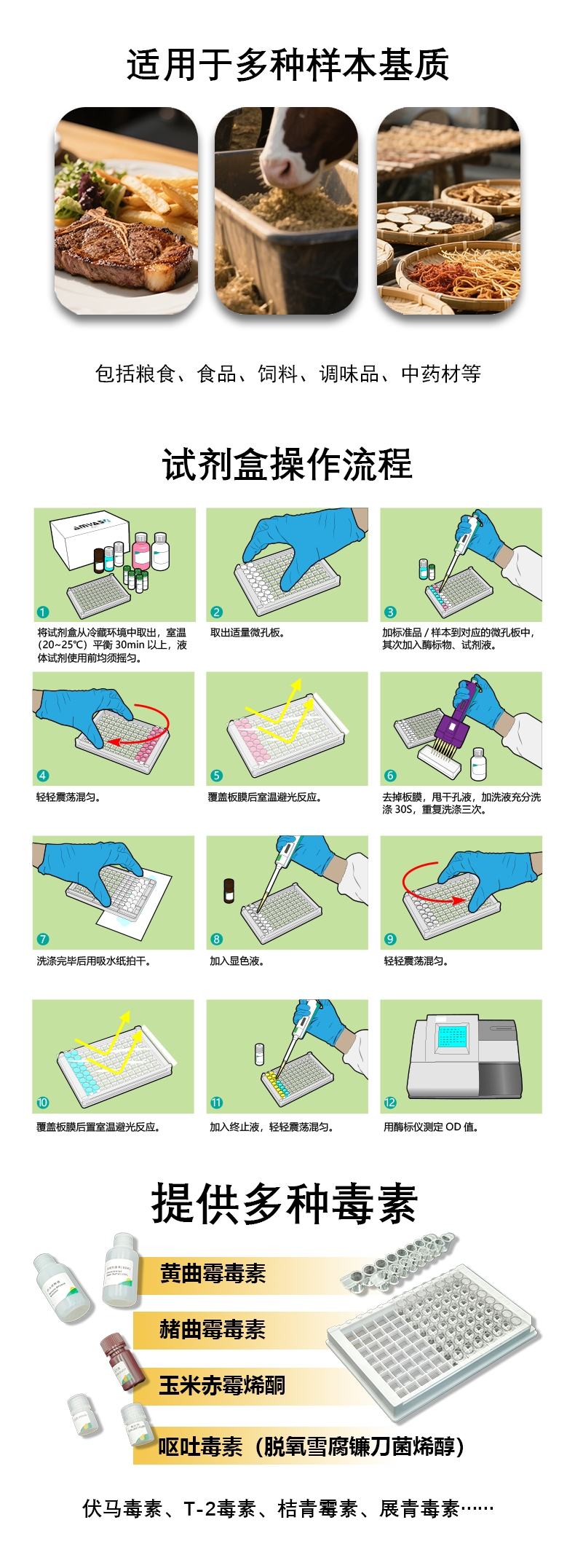 l 工作原理:本试剂盒采用直接竞争ELISA方法,在酶标板微孔上预包被真菌毒素抗原,样本中真菌毒素和此抗原竞争真菌毒素酶标抗体(酶标物),经显色液显色,样本吸光值与其含有的真菌毒素的量呈负相关,与标准曲线比较再乘以其对应的稀释倍数,即可得出样本中真菌毒素的含量。