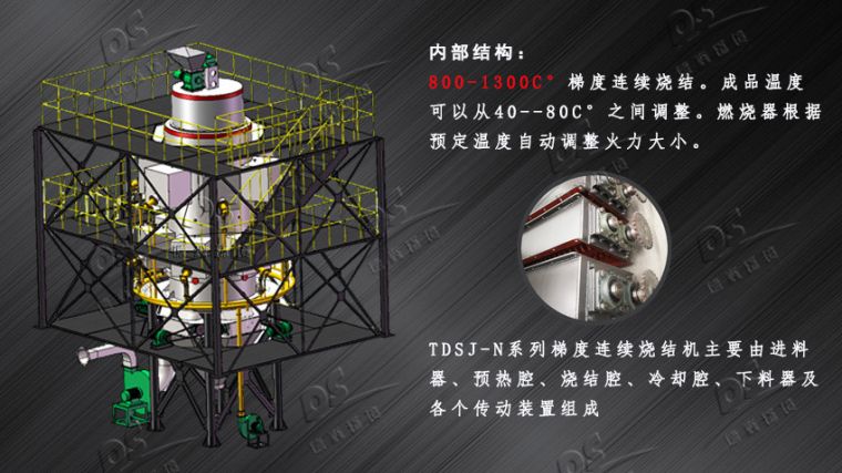 TDSJ-N系列梯度连续烧结机是德森环境**研发的发明专利设备,其综合技术指标处于**水平。该型梯度烧结机是当前粉煤灰、污泥、飞灰等大宗工业固废综合处理相关项目的关键设备,还可以广泛应用于环保、矿山、冶金、建材、耐火材料、陶瓷、化工等行业,是大宗工业固废处理、粉煤灰陶粒、固废陶粒、尾矿陶粒、工业飞灰陶粒、市政污泥陶粒、骨料烘干等项目的首先设备。其独特的烧结原理使得烧结物料颗粒度破损率低、产量大,并避免了高污染烟尘的产生,有效解决了回转窑耗能大、生产成本高、烧结物料破损率大的不足问题。特别在建筑陶粒加工方面具有产量高、粒形好、效率高、能耗低的独特优势。由其生产的5-20mm以下的骨料可广泛应用于冶金、矿山、建材等行业,尤其可为制作各种轻质陶粒墙材、砌块以及海绵城市透水砖等陶粒制品行业提供稳定可靠的高质建筑陶粒。