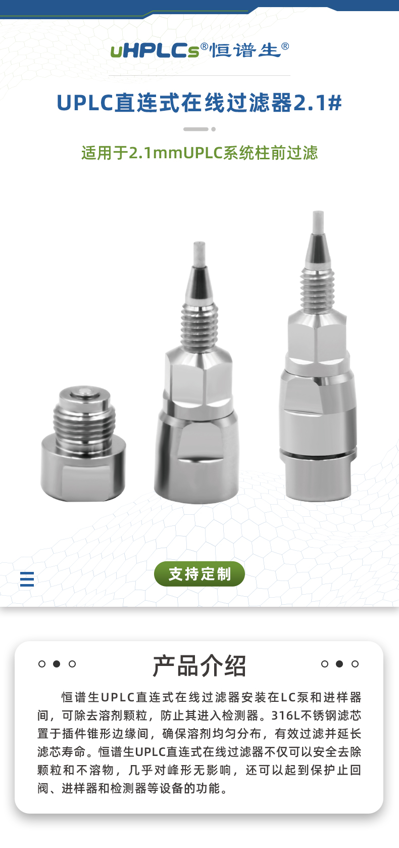 恒谱生色谱在线过滤器是一款专为高效液相色谱(HPLC)和超高效液相色谱(UPLC)系统设计的高性能过滤装置,具有以下特点和优势: