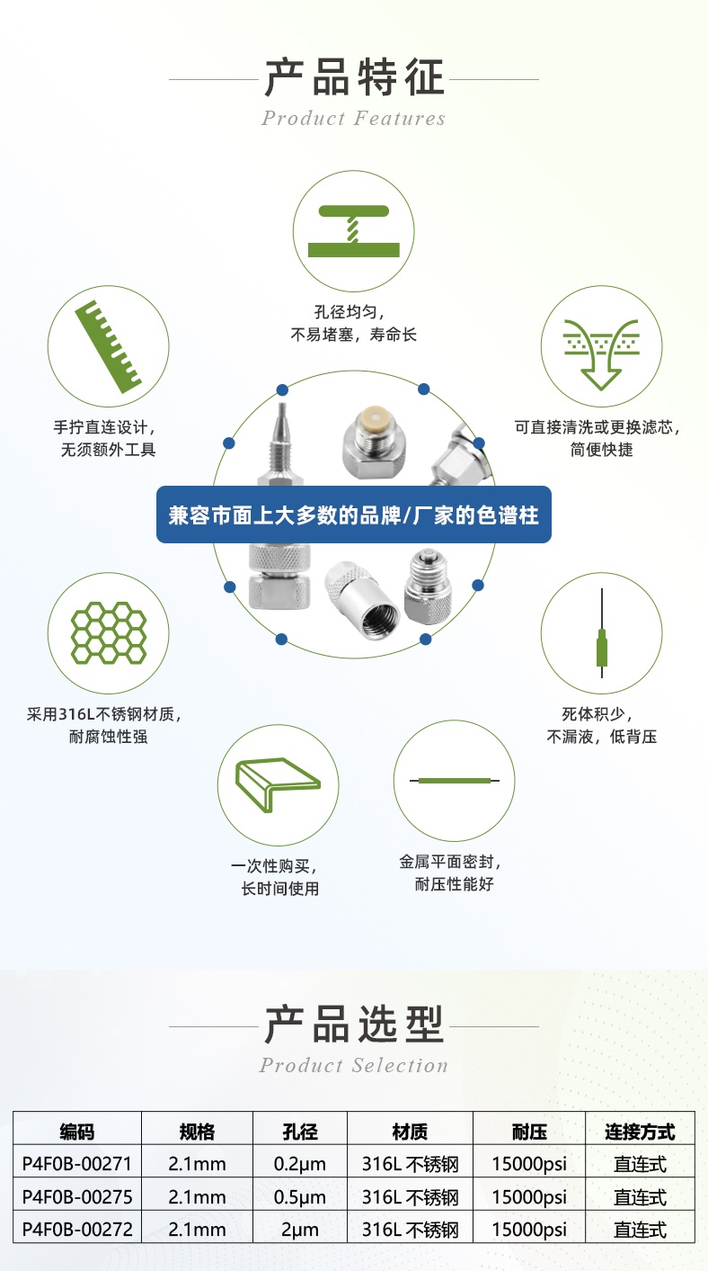 兼容市面上大多数品牌和厂家的色谱柱,适用于不同规格的色谱柱,如2.1mm、3.0mm、4.6mm、10mm、20mm、30mm等。