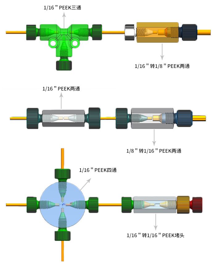 接头系列: PEEK 1/16“、1/8“、1/4“ 螺纹连接头,零死体积PEEK内/外螺纹连接两通;不锈钢1/16“、1/8“、1/4“ 螺纹连接头,不锈钢无死体积内/外螺纹连接两通; PEEK / 不锈钢压环。