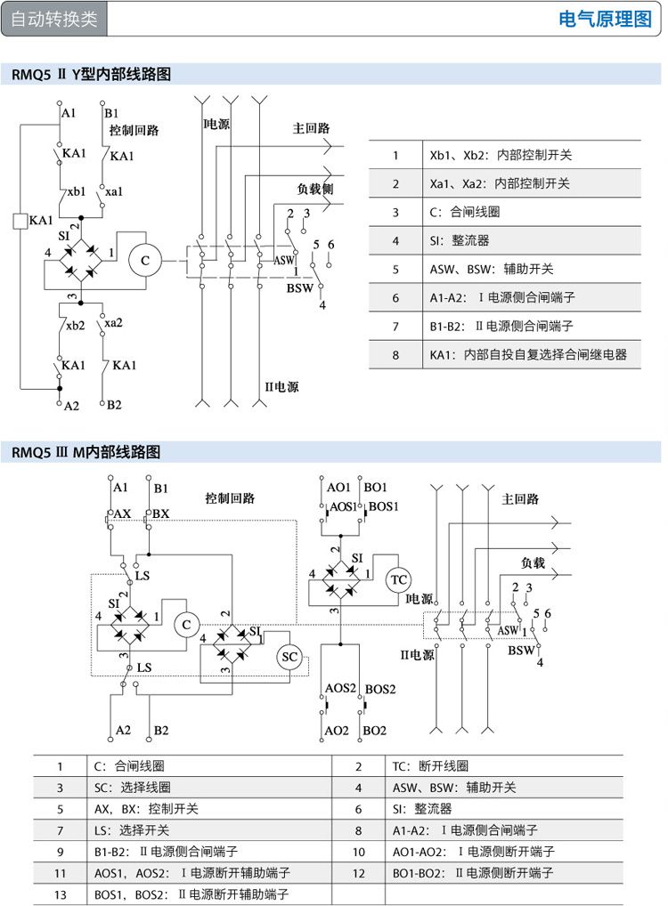 RMQ5双电源自动转换开关,由主回路、控制回路、操作机构、辅助开关等组成,用户可根据需要另行选配智能控