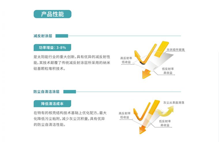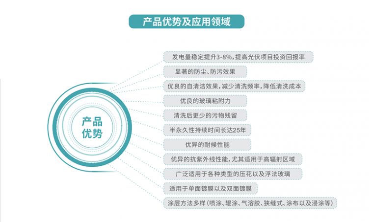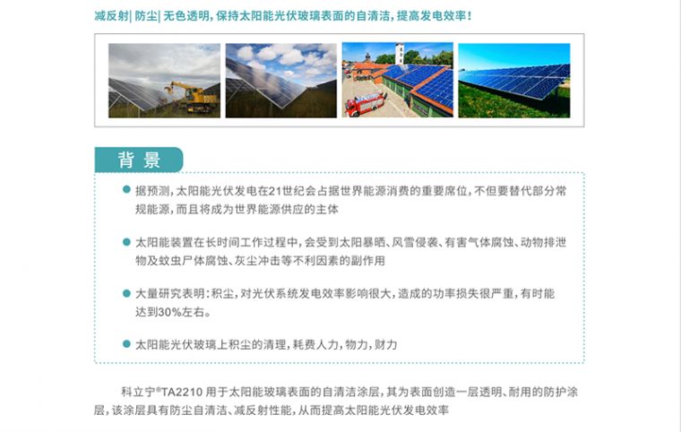 科立宁太阳能玻璃表面自清洁涂层,其为表面创造一层透明、耐用的防护涂层,该涂层具有防尘自清洁、减反射性能,从而提高太阳能光伏发电效率。