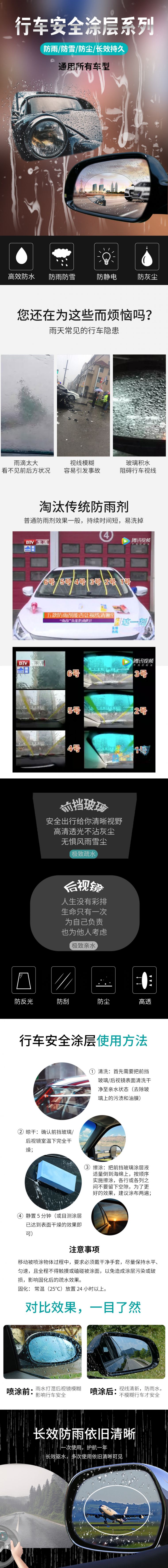 雨落无痕,视野清晰,365天超长防护,前挡玻璃、后视镜驱水剂。