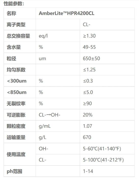 AmberLite™HPR4200CL是一款强碱阴离子交换树脂,通常应用在工业脱盐中,具有非常出色的运行能力和抗压能力,能够在较低的压力环境中使用,清洗、再生性能非常优异,可以有效减少化学再生剂和冲洗用水,可以与HPR9600树脂、HPR9500树脂混合成为混床树脂,在工业领域中应用非常广泛。在热电厂的水处理系统中也发挥了重要作用。热电厂在发电过程中需要用到大量的锅炉用水,这些用水的硬度过高会导致锅炉管道结垢,严重影响发电效率。通过使用离子交换树脂软化处理锅炉用水,不仅有效防止了管道结垢,还提高了发电效率,降低了能源消耗。