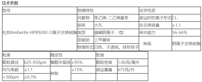 杜邦 HPR9200 Cl树脂作为市面上常见的一款离子交换树脂,相对其他品牌的树脂具有更多的优势,它的使用寿命相对更长、树脂的颗粒大小均匀,能够去除溶液中大部分的杂质,同时它的抗污染性非常强,能适应在不同溶液中使用;
