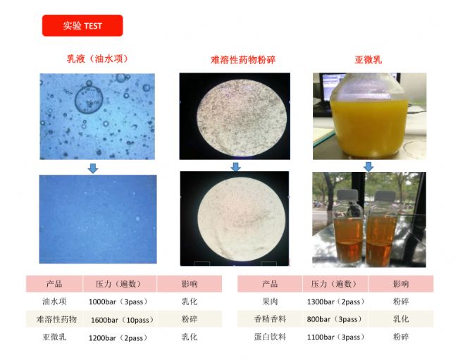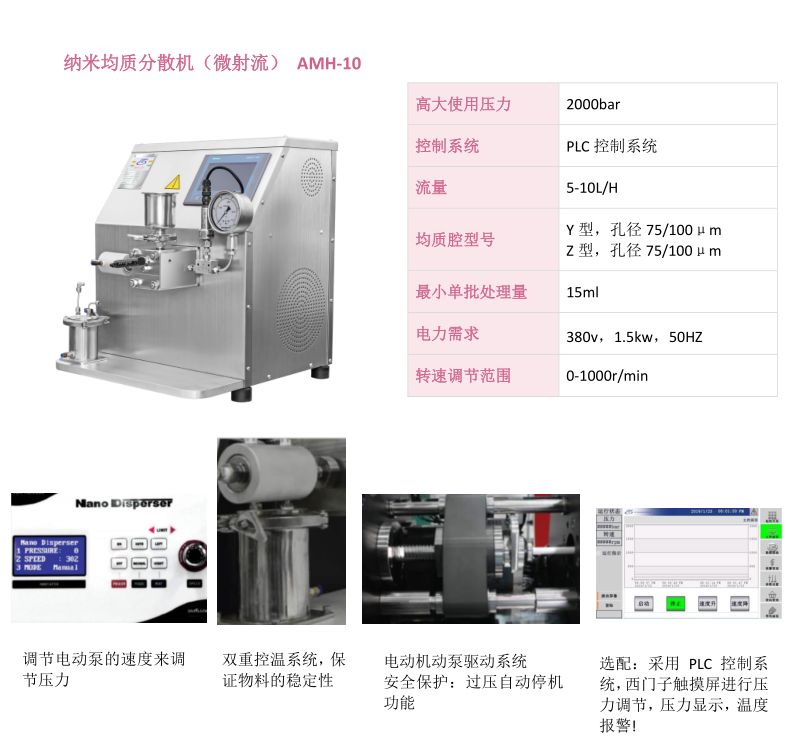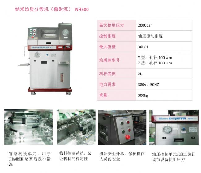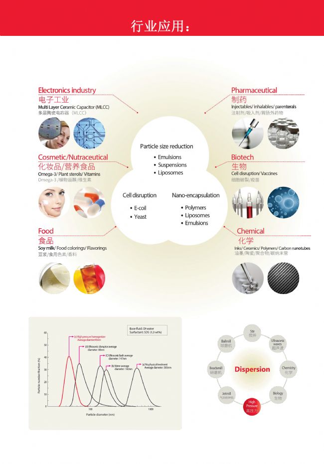 高压流体在加压状态下通过细孔模块时压力急剧下降而形成超声波流速此时的流体内会发生粒子冲击,空化和消流,剪切,应力作用下流体细胞的破坏,雾化,乳化,分散,脂质体等现象使用现有的智能搅拌机,超声波,球磨机等,相对于其它技术具有更高效率的电子材料,生命工程,制药, 食品, 纤维,涂料,化妆品等产业, 以至适用于广泛的领域高压流体在分散单元的狭小缝隙间快速通过。 此时流体内压力的急剧下降而形成的超声速流速,流体内的粒子碰撞,空化及漏流,剪切力作用于劈开纳米大小的细微分子便流体的成分以完全的均质的状态存在。