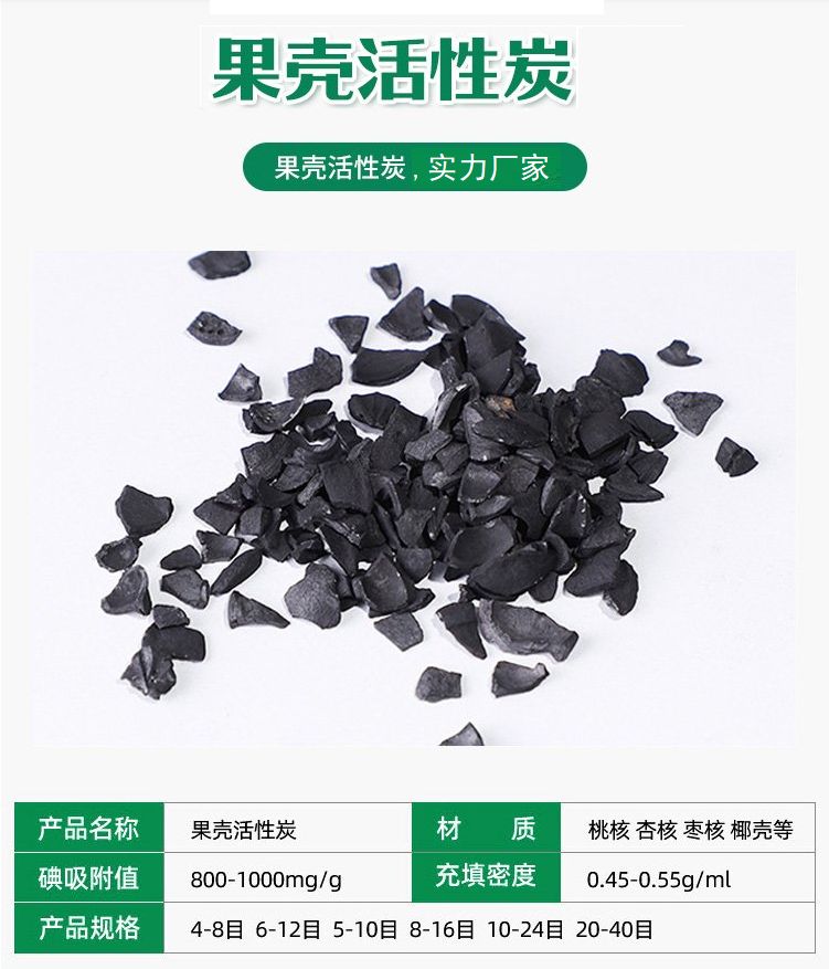 果壳活性炭以优质果壳、椰壳为原料,经系列生产工艺精加工而成。外观为黑色,呈颗粒状,具有空隙发达、吸附性能好、强度高、经济耐用等优点。 产品主要用于饮用水、纯净水、制酒、饮料、工业污水的净化、脱色、脱氯、除臭、干燥剂、催化载体等方面。