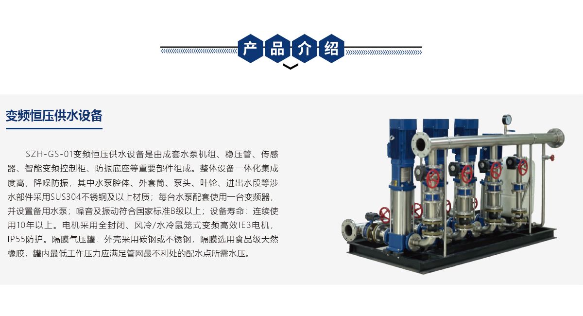 整体设备一体化集成度高,降噪防振,其中水泵腔体、外套筒、泵头、叶轮、进出水段等涉水部件采用SUS304不锈钢及以上材质;每台水泵配套使用一台变频器,并设置备用水泵;噪音及振动符合国家标准B级以上;设备寿命:连续使用10年以上。