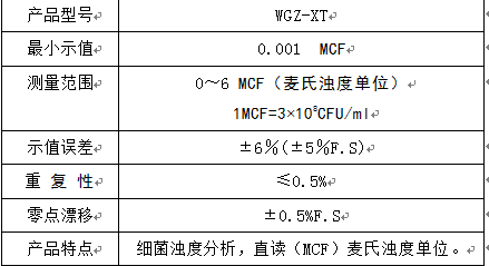 本仪器的基本原理是测量装置放入样品后,由光源发出的光束,在遇到细菌颗粒时形成散射光,由此产生的90°散射光的麦氏浊度信号由光敏元件接收,光信号经电路放大及单片微电脑数据处理后显示被测麦氏浊度值。