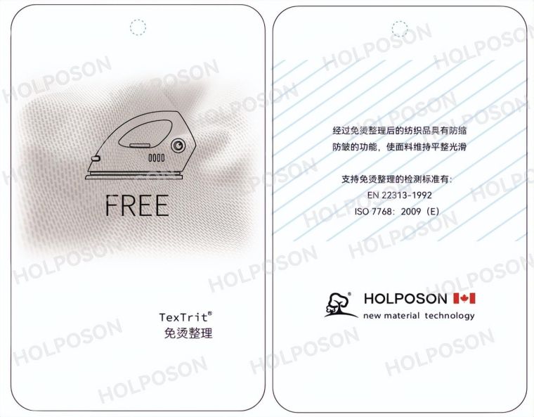 HOLPOSON® Ironing Free 树脂是纤维素纤维及其混纺织物洗可穿免烫整理的无甲醛整理剂,主要应用于以衬衫、职业装、帽子为主的服装面料的防皱整理,赋予面料良好的防皱免烫性能,穿着时不受拘束,不易起皱,手感柔软。