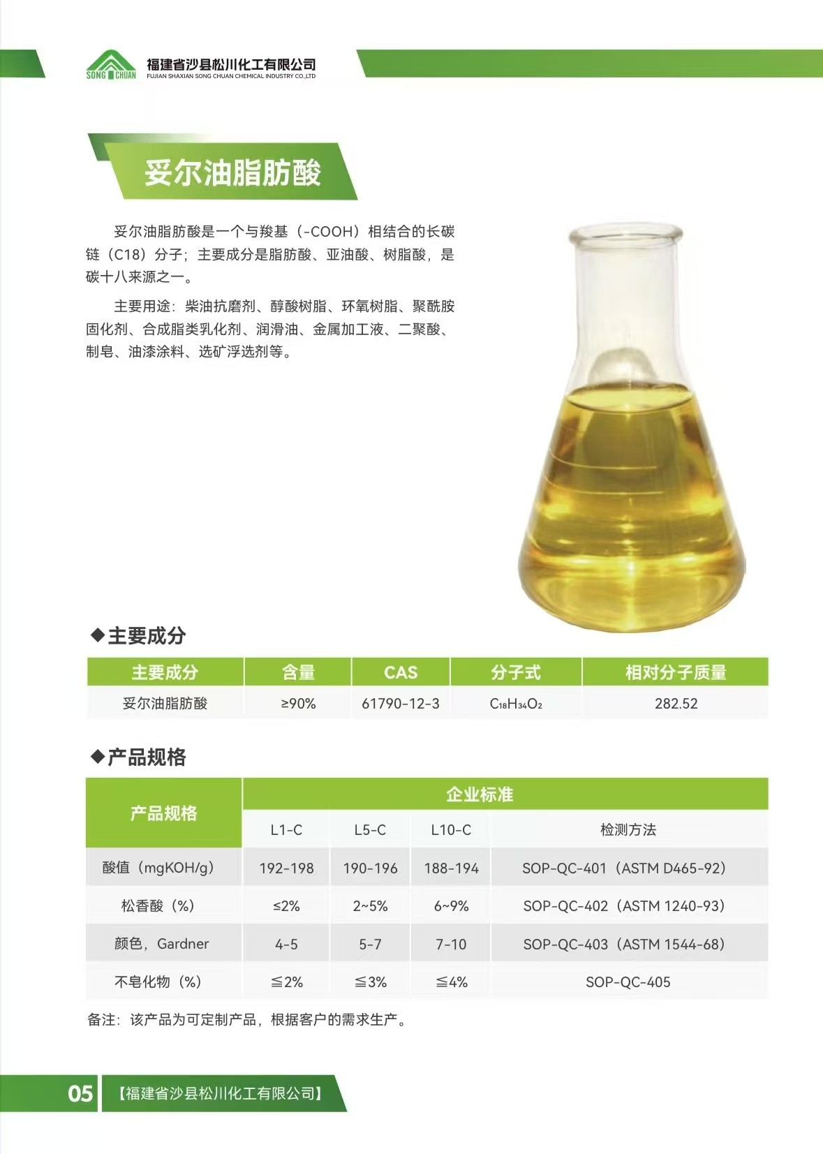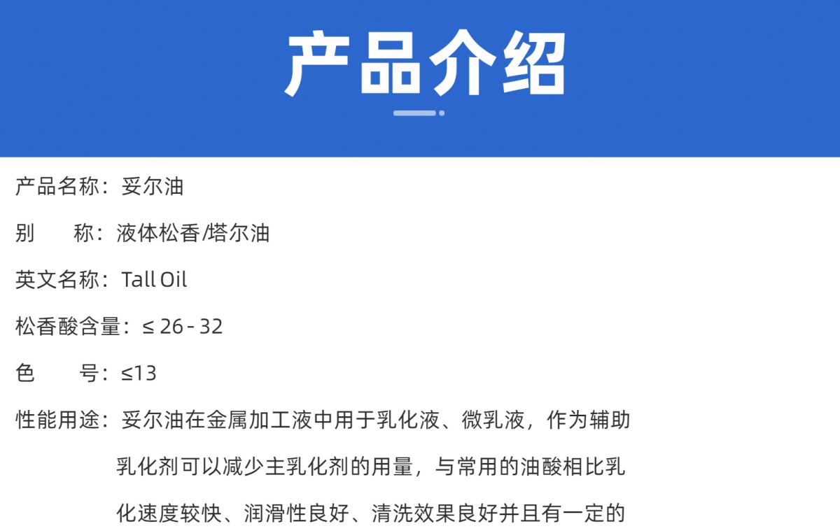 妥尓油脂肪酸L1O是生产高质量产品的化工原料应用于专业化学品领域,如二聚酸、环氧树脂和脂肪酸脂、润滑油、金属加工液、聚合物和纺织行业。