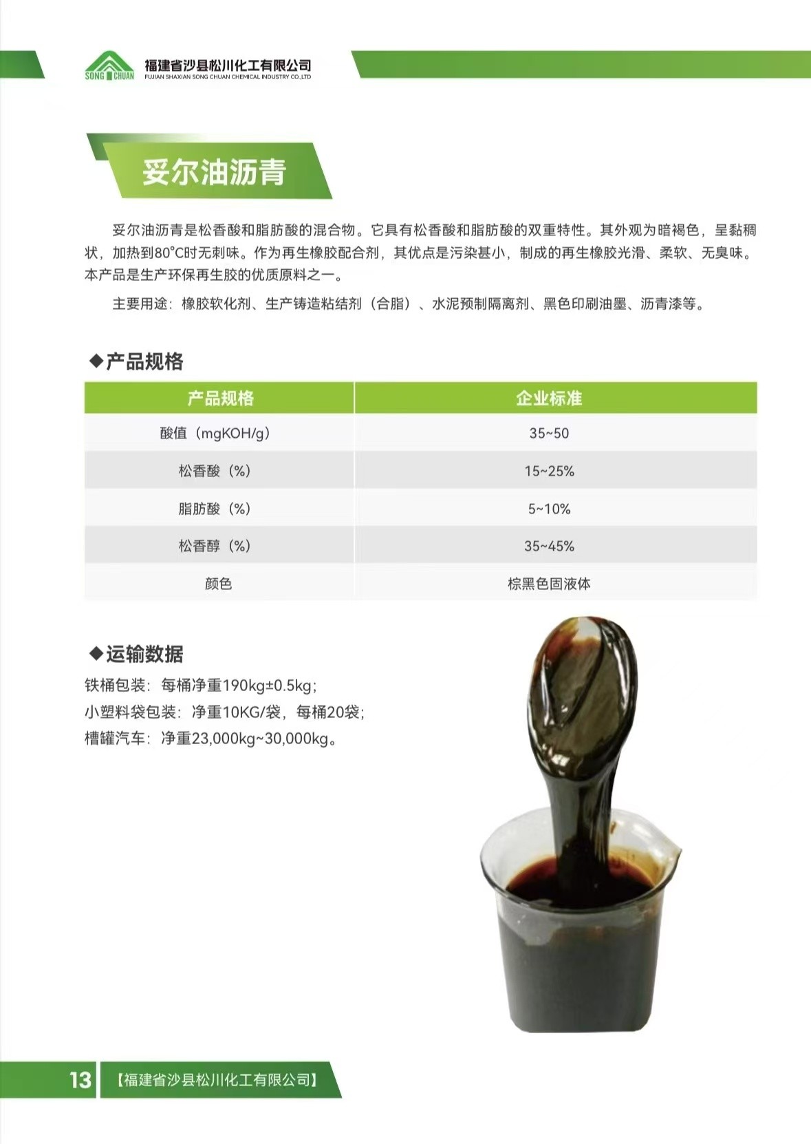 妥尔油沥青(环保妥尔油)是以粗妥尔油为主原料,经去水蒸馏除味配制而成。其外观为暗褐色,呈粘稠状,加热至80℃时无刺味。作为再生橡胶配合剂,其优点是污染甚小,制成的再生橡胶光滑、柔软、无臭味。本产品是生产环保再生胶的**原料,可用于生产铸造粘结剂(合脂),橡胶软化剂,其被广泛用作乳化剂增加丁苯橡胶(SBR)的流动性。也可应用于矿石浮选剂、生产铸造粘结剂(合脂)、橡胶软化剂、水泥预制隔离剂、沥青漆等领域。