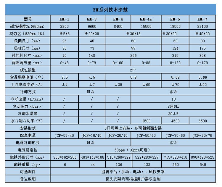 ※电磁铁采用自然冷却结构,当磁极间距为20mm,磁场≥1.0T时,持续工作时间30分钟,温升小于30℃