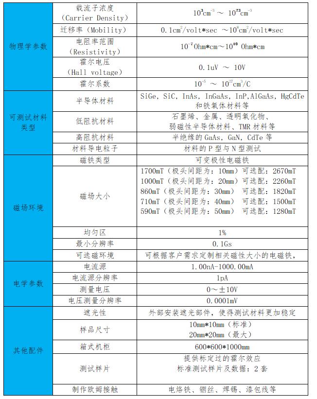 本仪器系统由:实验室电磁铁、高精度双极性电源、内置高斯计、高精度原表JH401、霍尔探头、电缆、标准样品、样品安装架、系统软件。 实验结果由软件自动计算得到,可同时得到体载流子浓度(Bulk Carrier Concentration)、表面载流子浓度(Sheet Carrier Concentration)、迁移率(Mobility)、电阻率(Resistivity)、霍尔系数(Hall Coefficient)、磁致电阻(Magnetoresistance)等等。
