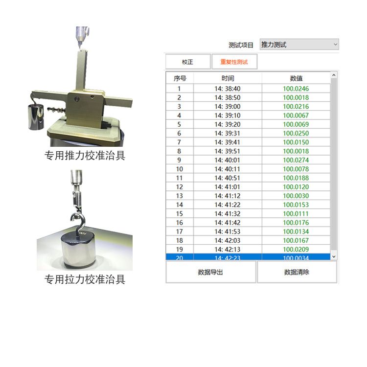 软件自带校准、重复性测试、线性测试功能;砝码满足国家标准,可于第三方检测。