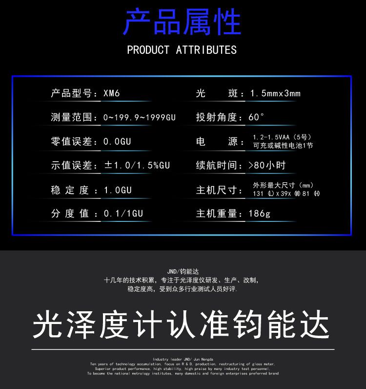 XM6 小孔径便携式光泽度计是参照标准ISO 2813和GB9754 设计制造的便携式光泽度测量仪器。其技术参数同时符合ASTM D2457、ASTM D523及GB/T13891、GB7706、GB8807标准中的规定.为适应小平面和宽范围的光泽测量,该型号仪器采用微小测量光斑和窗口,并且根据光泽定义延申拓宽测量范围,性能指标达到标准JJG 696《镜像光泽度计和光泽度板》计量检定规程中一级工作机要求。