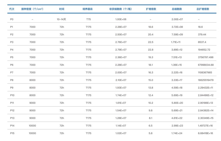 以一根脐带为例,如分离约10g华通氏胶组织,P0代可获得2.0E7细胞,P3代理论可获得1.71E11的细胞。
