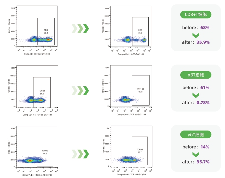 从全血中高效快速去除αβT细胞,通过密度梯度负选原理实现高纯度γδT细胞富集,为后续γδT细胞的高纯度扩增奠定基础。