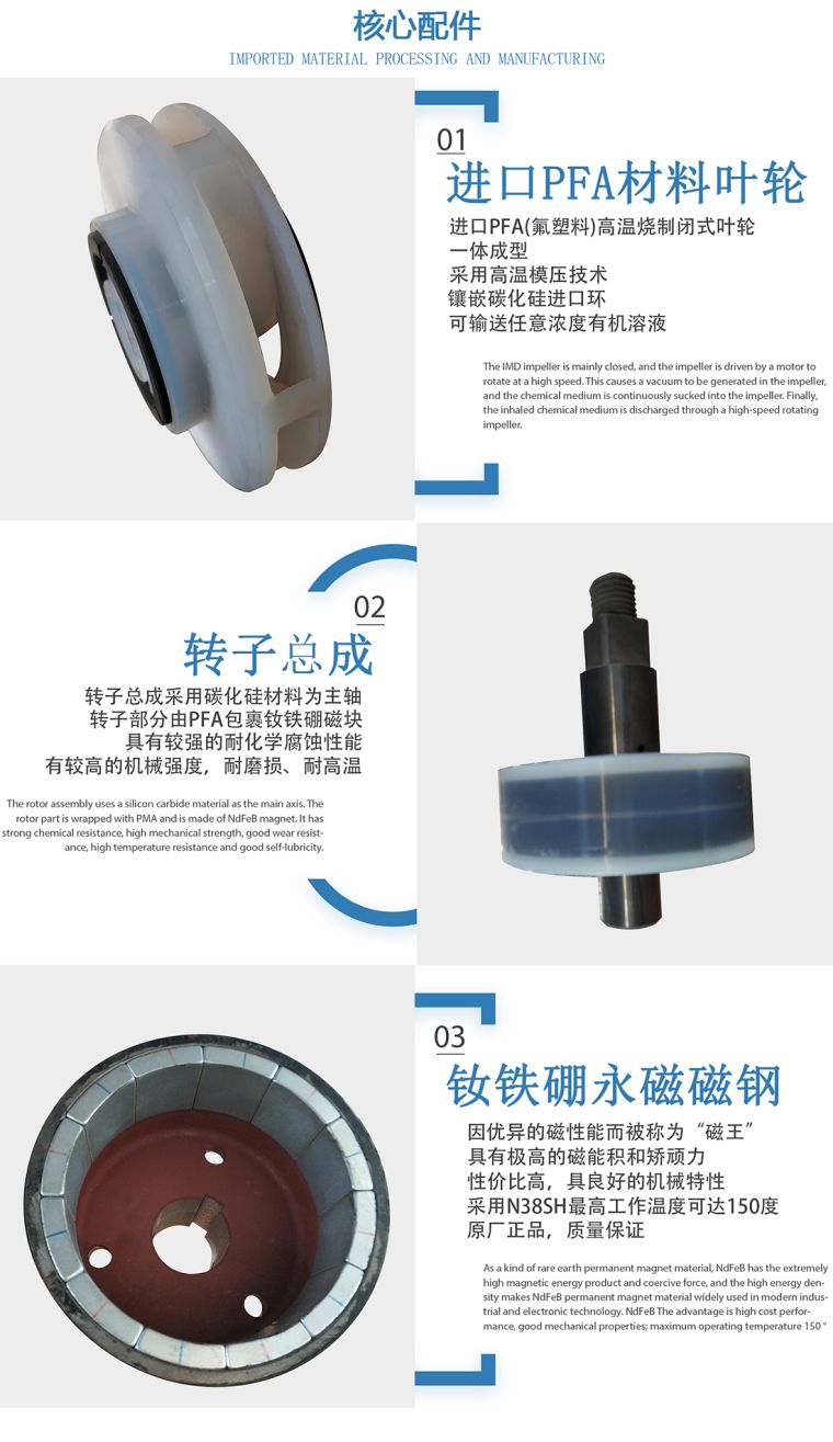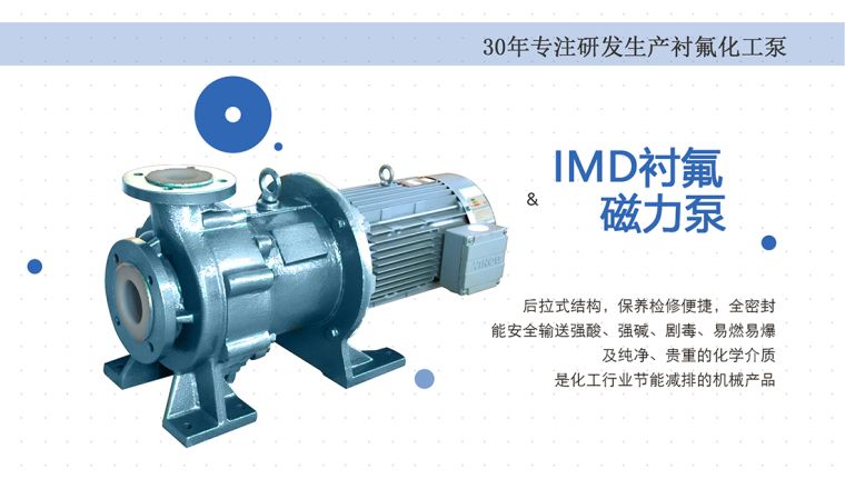 IMD氟塑料磁力泵在传统耐腐蚀磁力泵的设计基础上,吸收国际先进设计理念,优化零件结构,彻底消除了磁涡流,强劲的次扭矩,使产品高效、节能、环保。氟塑料磁力泵的用途:能安全输送强酸、强碱、剧毒、有机溶剂、及纯净、贵重的化学介质,适用于各种化工流程,充分满足严格的安全性、可靠性和生态环保要求,是化工行业节能减排的机械产品。流量范围:4T/h-200T/h,扬程范围:18m-60m,功率范围:3kw-55kw,运行温度:-20℃—110℃。可根据实际工况要求变更配置。
