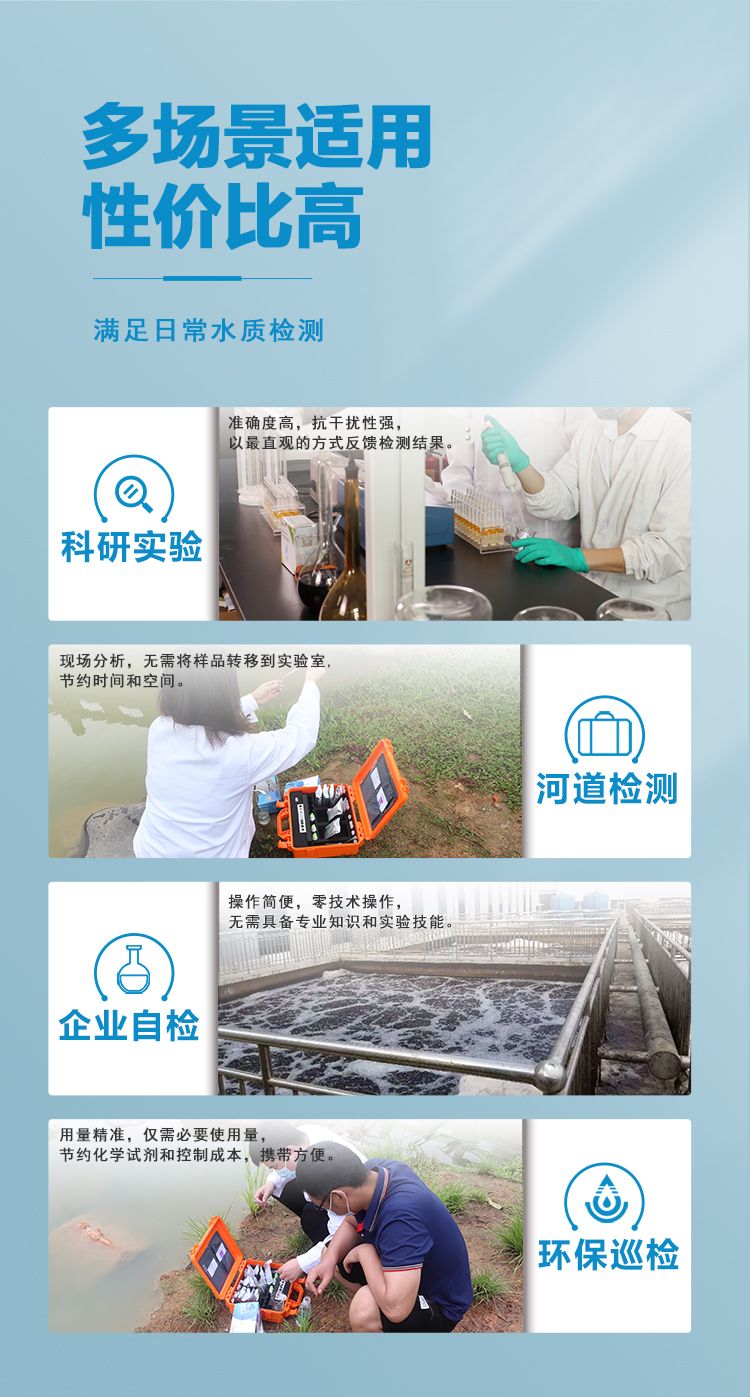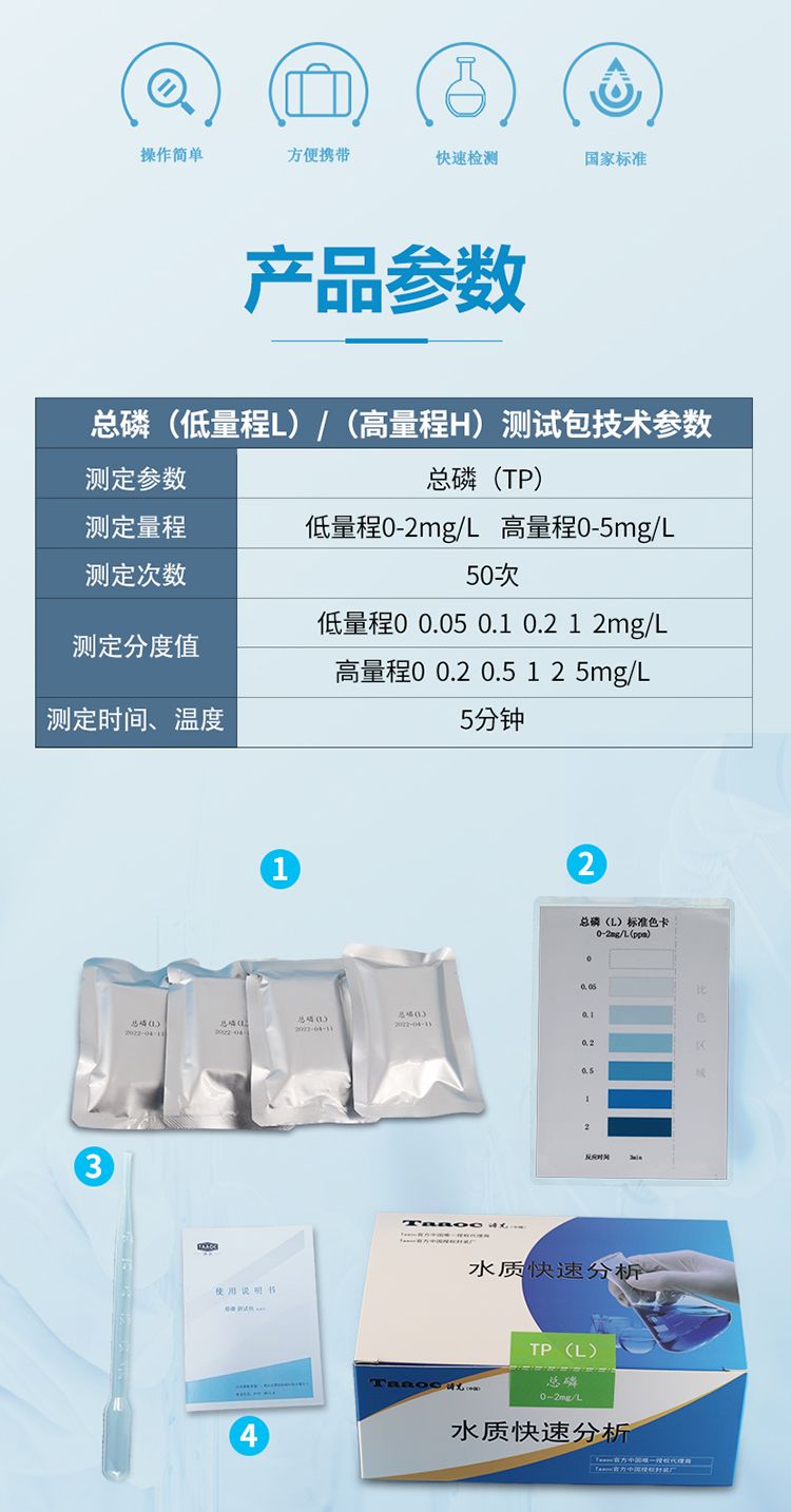 涛克总磷水质快速检测包可快速测定水中的总磷含量,小巧、便捷,便于携带,无论您是在生产现场进行快速测定,还是在户外进行快速排查,测试包均能满足您的水质检测使用需求。测试包集成了水质分析领域成熟技术,整个操作流程简单、快速,检测结果稳定可靠。广泛应用于科研实验、河道检测、企业自检、环保巡检等领域。