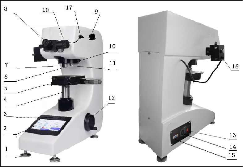 6. 压头 | 7. 10X物镜 | 8测微目镜 | 9. 变换手轮 | 10. 转塔 |