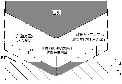 试验开始时,试验机压头放在试件上,施加初试验力,并建立一由位移传测量装置测出的基准点。因为初试验力使压头压入试件,所以表面的光洁或不规则不会影响试验。接着试验机施加主试验力,这一较大的力,进入试样更深,然后卸除主试验力,同时保持初试验力,此时,试验机测量相对于既定的基准点的凹痕深度。凹痕的直线深度是洛氏硬度数值的基础。凹痕深度浅只表示材料硬度较高,凹痕深度相对深,则表示材料硬度较软。