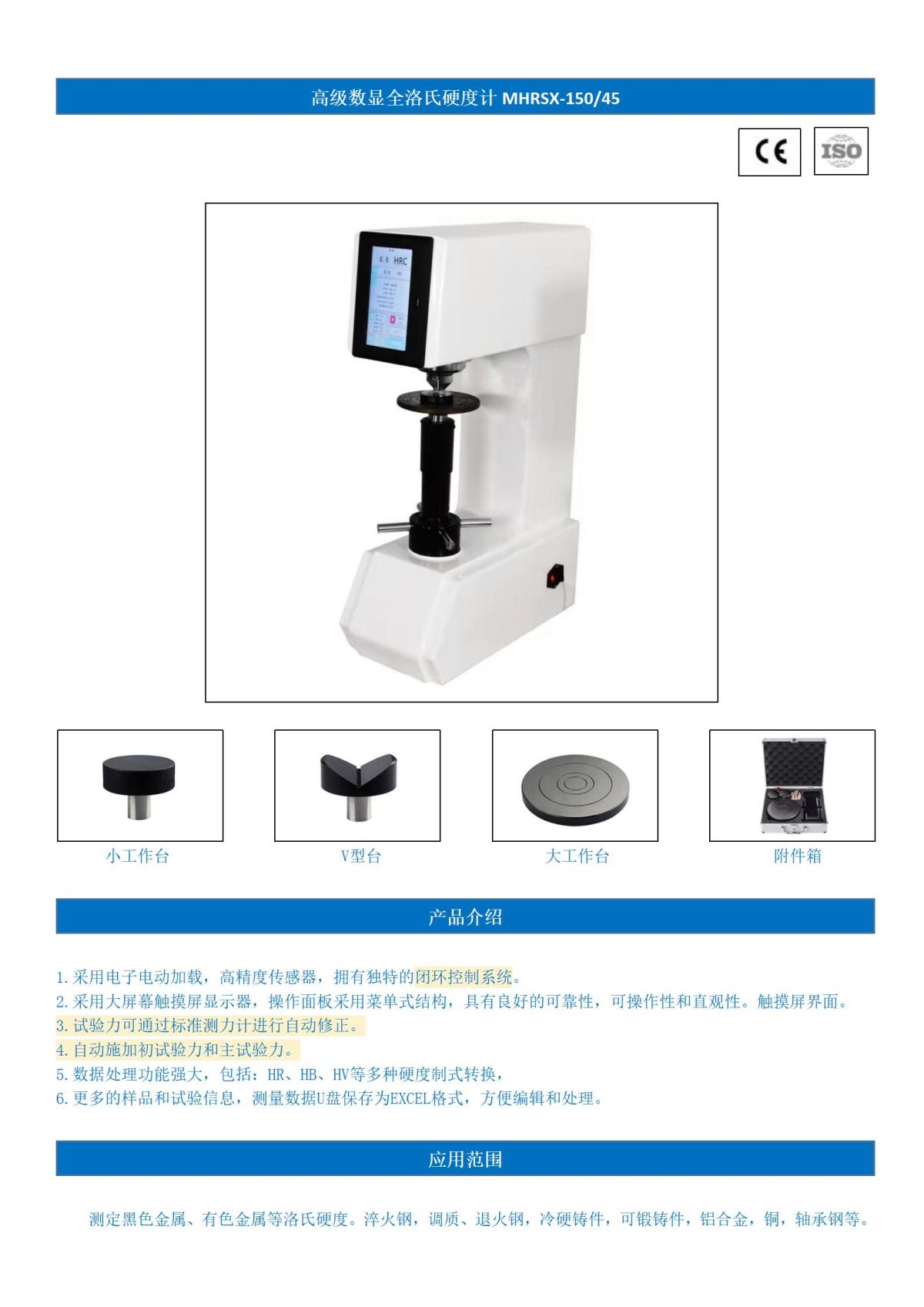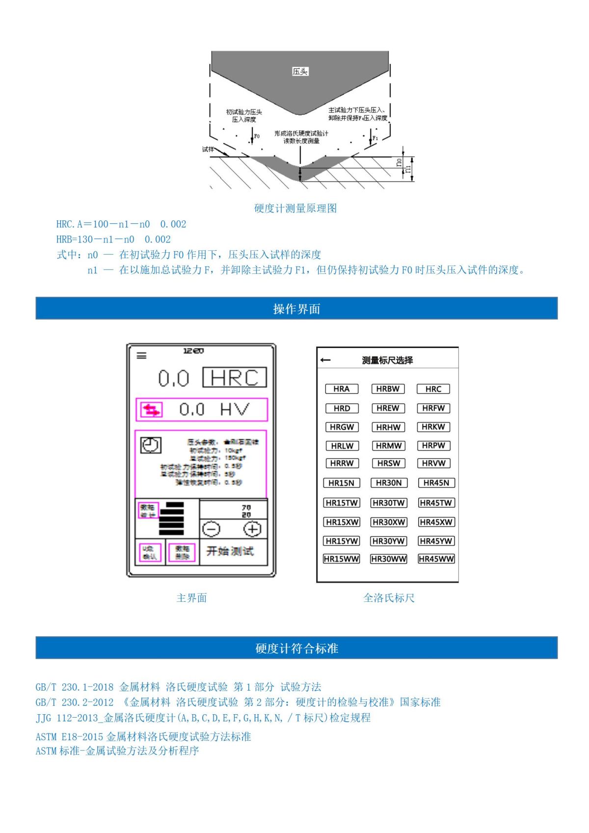 硬度制式:HRA、HRB、HRC、HRD、HRE、HRF、HRG、HRH、HRK、 HRL、HRM、HRR、HRP、HRS、HRV 15N、15T、15W、15X、15Y、30N、30T、30W、30X、30Y、45N、45T、45W、45X、45Y