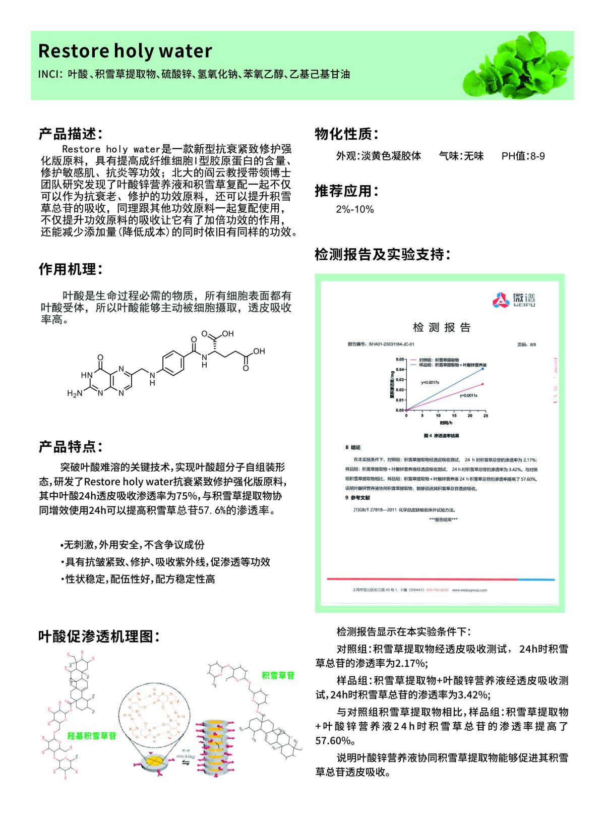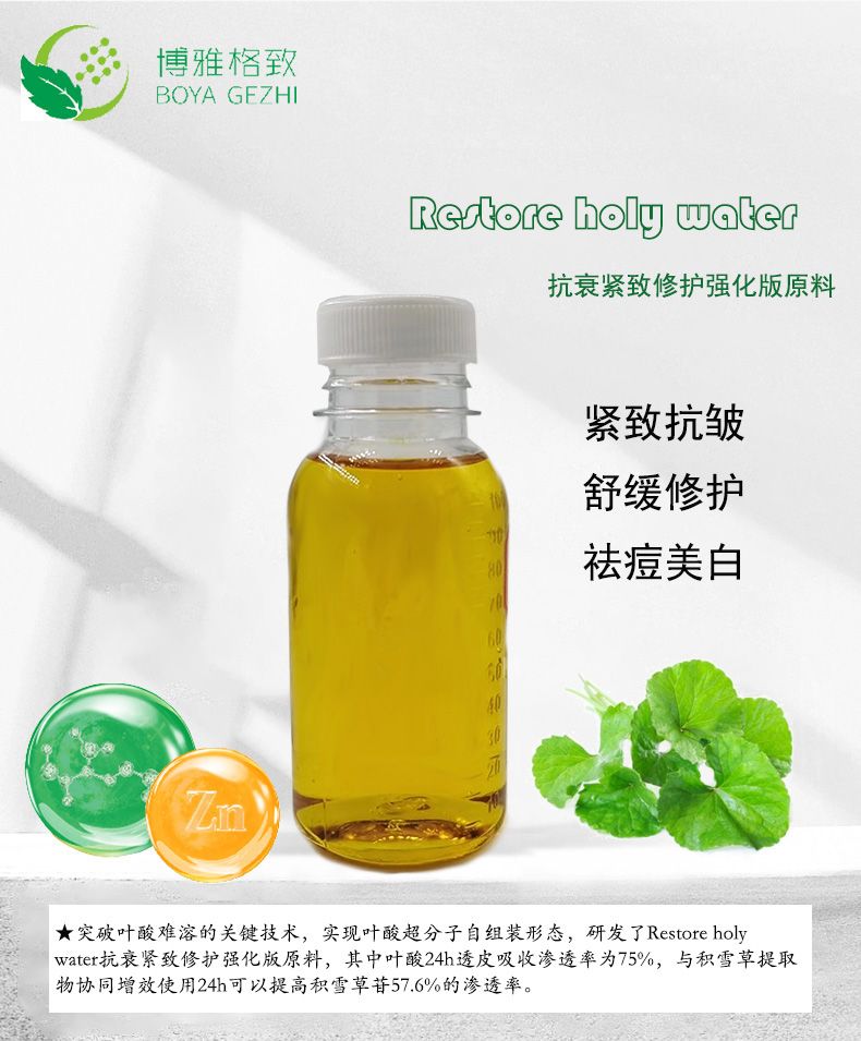 Restore holy water是北大研发的一款新型抗衰紧致修护强化版原料,具有提高成纤维细胞I型胶原蛋白的含量、修护敏感肌、抗炎等功效;解决了叶酸难溶的关键技术,与积雪草提取物协同增效使用可以促进积雪草总苷的透皮吸收,使功效成分真正作用于皮肤。