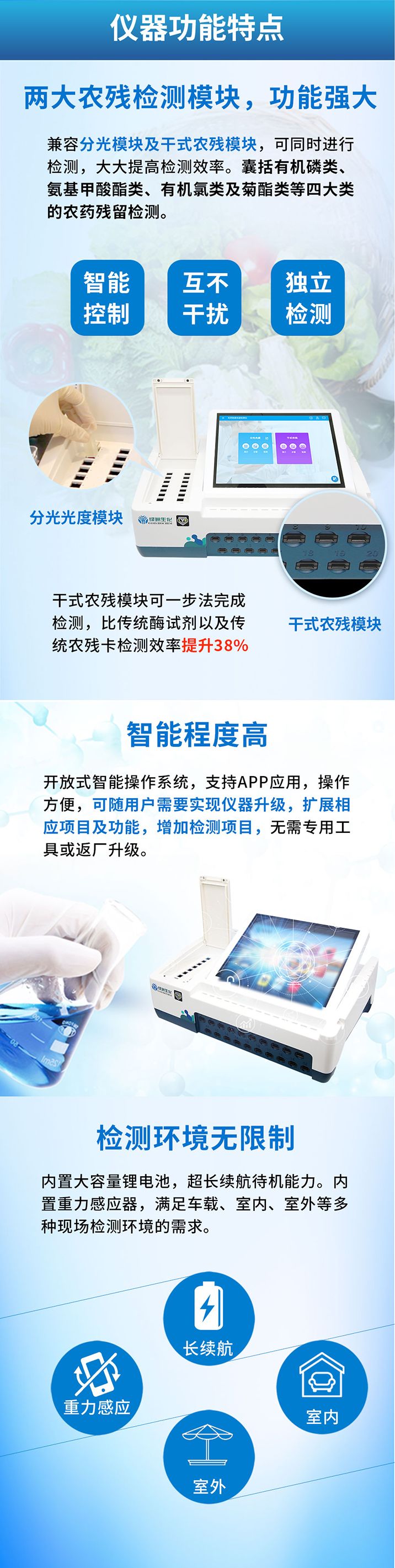 ★产品特点:◇两大农残检测模块,功能强大兼容分光农残模块及干式农残模块,可同时进行检测,大大提高检测效率。囊括有机磷类、氨基甲酸酯类、有机氯类及菊酯类等四大类的的农药残留检测。干式农残模块可一步法完成检测,比传统酶试剂以及传统农残卡检测效率提升38%。