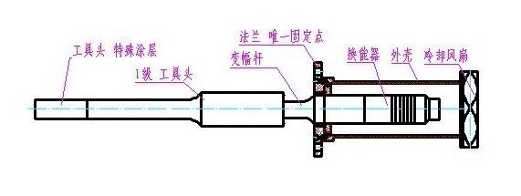 超声波驱动电源起着将50Hz-60Hz的市电(交流220V)转化为高功率、高频率的电信号并输出给超声波振动部件的作用。超声波振动设备主要包括大功率超声波换能器、变幅杆、焊接法兰、工具头,用于产生超声波振动,并向工艺对象中发射此振动能量。换能器在纵向做来回伸缩运动,从而将输入的电能转换成机械能(即超声波),变幅杆依据设计需求来放大振幅,隔离反应溶液和换能器,一般情况下,变幅杆与发射头之间连接有焊接法兰,焊接法兰起到固定整个超声波振动系统的作用。变幅杆与工具头相连,变幅杆将从换能器传递过来的超声波振动能量传递给工具头,最后通过工具头将超声波振动能量发射到工艺对象中。