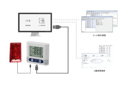 方法二: 当您对数据分析有更多要求时,请选配专用软件下载数据,通过专用软件可以查看数据报表、数据曲线、数据统计、记录备注等信息,还可输出PDF数据文件。 ①拷贝专用软件到您的电脑,绿色软件,无需安装,打开即可使用。 ②连接记录仪到电脑,进行参数设置。 ③记录仪脱离电脑,放置到需要检测的环境进行记录工作。 ④连接记录仪到电脑,通过软件查看历史数据、历史曲线、数据统计等,进行数据打印、输出PDF等格式文件操作。 | |