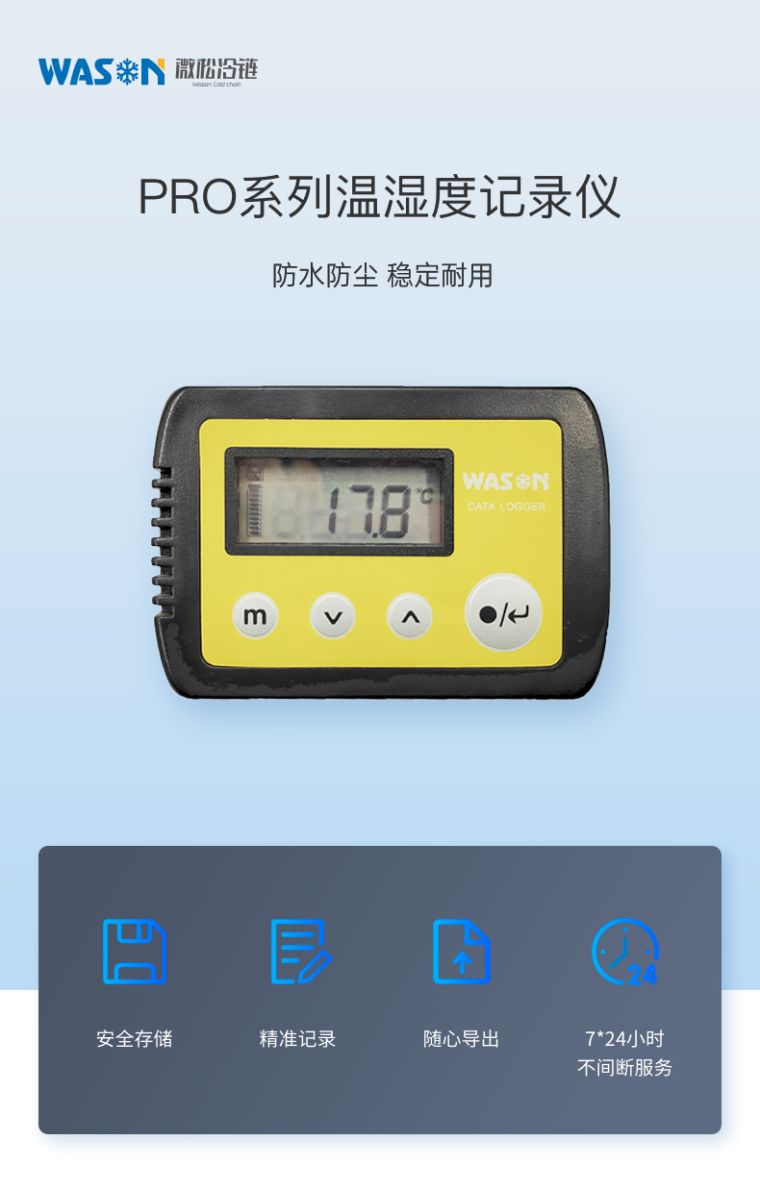 微松微松PRO系列温湿度记录仪是一款数据自动存储的单机型精密仪表。该仪表采用低功耗设计,待机时间长;双腔结构,防水等级高;传感器型号多,检测范围广。使用C-mi软件可实现参数设置、数据下载、数据分析、数据导出等功能,也可不使用C-mi软件直接从记录仪内拷贝CSV格式数据。广泛应用于食品医药、冷链物流、化工电子、档案文博、农业科研等领域。