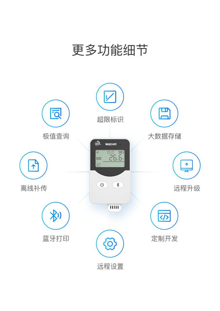 1)最大最小值可按键查询; 2)LCD液晶显示当前值与报警状态; 3)GPRS(4G)传输,距离不受限制; 4)实时位置定位; 5)自带内存,离线数据自动补传; 6)远程监测记录,数据云存储; 7)高能锂电池,待机时间长; 8)可配蓝牙打印机,现场一键打印数据; 9)固件可OTA空中升级; 10)丰富的故障代码,维护方便。 |
