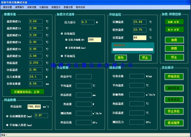 仪器特点:自动加压,自动测厚,实验全自动控制。6点温度梯度检测,提高测试精度。可检测不同压力下热阻曲线,采用优化的数学模型,测量材料导热系数和热阻以及界面处接触热阻等。