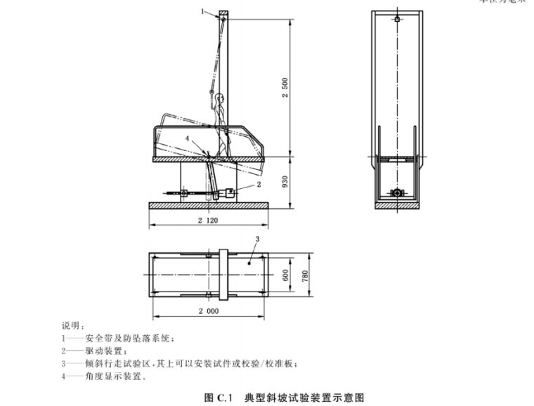 试验装置主要由一个上面能安放试件、两旁有护栏、上方有安全带等安全装置的宽约600 mm、长约2 000 mm的平台构成。平台受试验人员控制,能从水平位置开始在0°〜45°之冋连续转动、转角精 度土0.2°.因试验人员在I:面行走而对角度的影响不应超过土0.5\平台还配套有在试验期间能以(6.0± L0)L/min的流觉将洗涤剂溶液大致均匀喷洒在试件表而的喷水装置。试验装置示意图见图C.1。