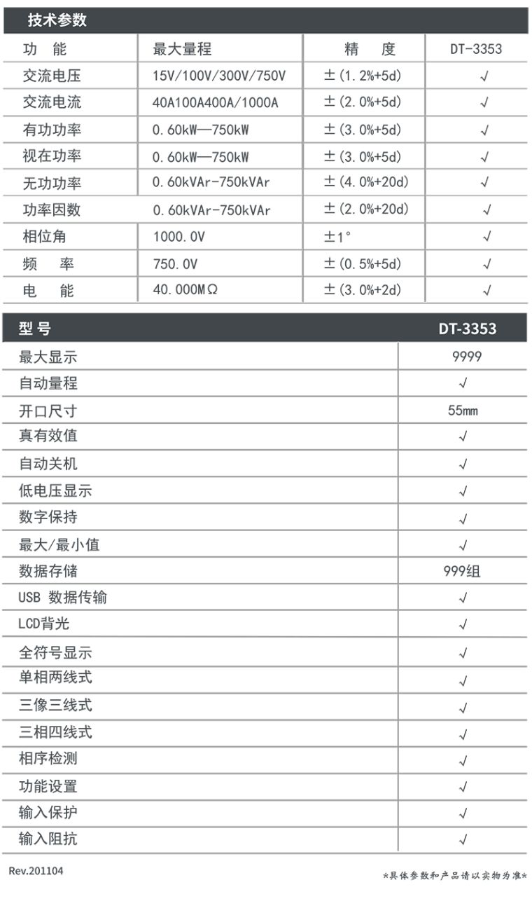 CEM DT-3353专业真有效值1000A交流功率钳形表提供准确的功率、交流电流电压的读数和波形。CEM DT-3353 1000A真有效值功率数字钳形表专为简单、快捷测量而研发、设计和生产。大屏双液晶显示方便提供准确的功率、交流电压电流的读取数据和波形。 人性化和科学的设计确保您准确、快速和安全的测量得到出色完成。
