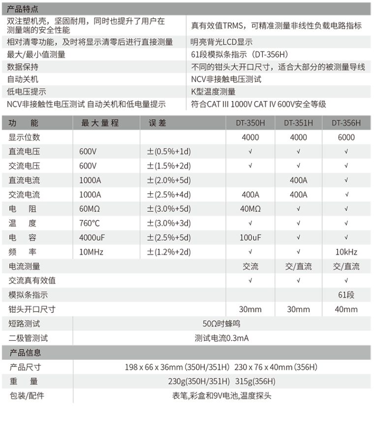 CEM DT-350H/351H/356H是CEM华盛昌在国内市场新推出的一系列真有效值自动量程数字钳形表,双注塑外壳坚固耐用,符合人体工程学的设计在测量时更易于握持,高精度测量和大小适中尺寸钳口适合于手持以及伸入排线紧密的区域,测试表位置可固定便于单手操作当前测试值。高清背光LCD显示易于读取测试值数据,真有效值TRMS准确测量非线性负载电路指标,此系列表在电力行业、维修行业、机械设备维修和保养、电路检测等领域发挥重要作用。
